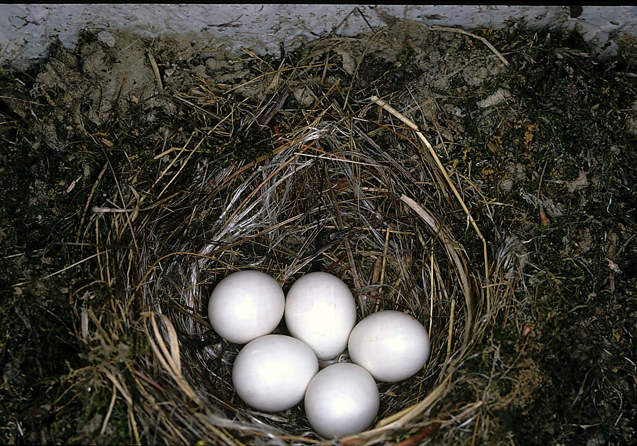 My own delight deepened when a phoebe moved into our yard and built a nest on a 2x4 Dennis put up for her above a sunroom window one spring. For more than a month we watched in awe, monitoring her every move as she entertained us, incubating her clutch of eggs, then faithfully filling those gaping mouths—were there really six babies crammed in that tiny moss cradle? Which all fledged at once one sunny morning, spreading out across the neighbourhood and leaving us “empty-nesters” lonely and bereft.